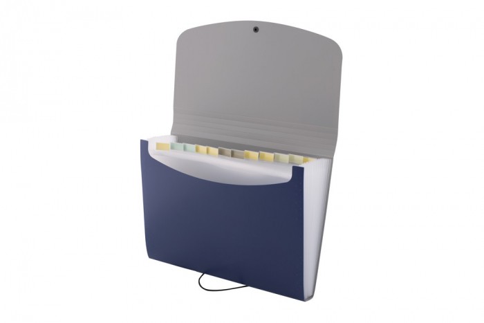 Poręczna teczka segregująca na dokumenty w formacie A4. Wyposażona w 12 przegródek służących do skutecznej segregacji dokumentów według np. dat. Niezbędna w pracy w terenie, podczas konferencji czy wyjazdu służbowego. Niezawodna pomoc w porządkowaniu notatek, idealna dla każdego licealisty i studenta. Zamykanie na gumkę zabezpiecza przed wypadaniem dokumentów podczas przenoszenia. Wewnętrze przegródki wyposażone są w kolorowe wymienne etykiety do opisu zawartości. Teczka wykonana jest z mocnej folii PP. Klapa w kolorze szarym, ścianki teczki w jednym z 4 kolorów: czarnym, czerwonym, niebieskim lub zielonym. Kolor: niebieski