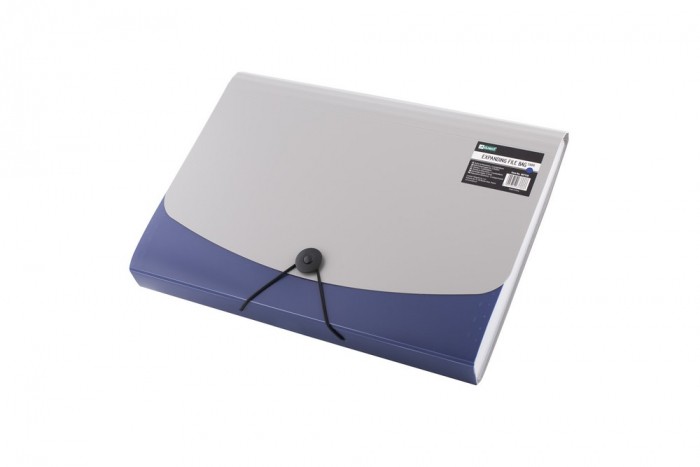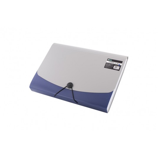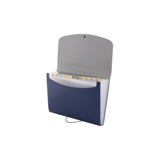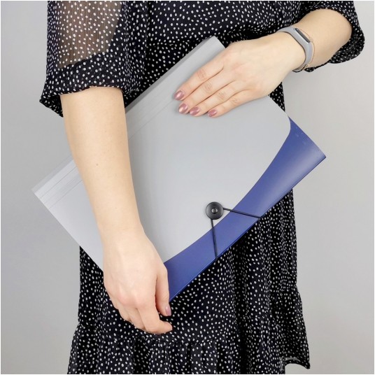 Poręczna teczka segregująca na dokumenty w formacie A4. Wyposażona w 12 przegródek służących do skutecznej segregacji dokumentów według np. dat. Niezbędna w pracy w terenie, podczas konferencji czy wyjazdu służbowego. Niezawodna pomoc w porządkowaniu notatek, idealna dla każdego licealisty i studenta. Zamykanie na gumkę zabezpiecza przed wypadaniem dokumentów podczas przenoszenia. Wewnętrze przegródki wyposażone są w kolorowe wymienne etykiety do opisu zawartości. Teczka wykonana jest z mocnej folii PP. Klapa w kolorze szarym, ścianki teczki w jednym z 4 kolorów: czarnym, czerwonym, niebieskim lub zielonym. Kolor: niebieski