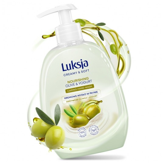 Kremowe mydło w płynie Luksja Oliwka i Jogurt łagodnie oczyszcza i pielęgnuje dłonie podczas każdego mycia. Delikatna formuła zawiera oliwę z oliwek i jogurt, oferujące skórze odżywienie i miękkość. Została wzbogacona o glicerynę, która wykazuje doskonałe działanie pielęgnujące.