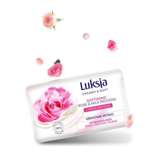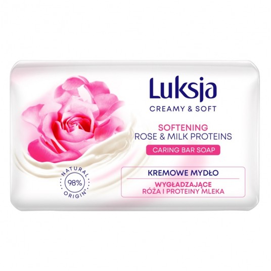 Kremowe mydło w kostce Luksja Róża i Proteiny mleka delikatnie oczyszcza dłonie, pielęgnując skórę podczas każdego mycia. Zostało wzbogacone o ekstrakt z róży i proteiny mleka wykazujące nawilżające i zmiękczające właściwości. Pozostawia gładkie dłonie.