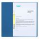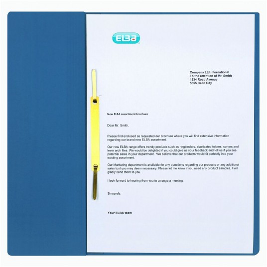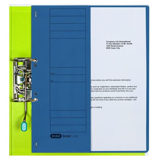 Skoroszyt A4, wykonany kartonu Manilla barwionego w masie. Frontowa okładka została zmniejszona o połowę, dzięki czemu dokumenty są widoczne bez otwierania skoroszytu. Uniwersalny zaczep oczkowy pozwala na wpięcie skoroszytu do każdego segregatora. Specjalne bigowanie na grzbiecie umożliwia jego poszerzenie dla zwiększenia pojemności.