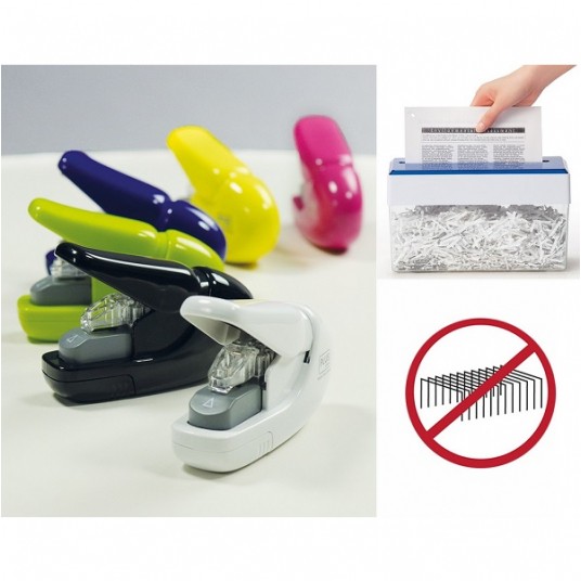 Zupełnie nowy pomysł na zszywacz biurowy: zszywanie następuje bez użycia zszywek, samym papierem. Zszywacz jest przyjazny dla środowiska, pliki łączone są za pomocą samego papieru. Zalecany szczególnie do użytku w firmach produkcyjnych z branży żywieniowej oraz restauracjach, gdzie zabronione jest stosowanie zszywek, spinaczy i pinezek. Plik zszyty w ten sposób można włożyć bezpośrednio do niszczarki tnącej bez konieczności usuwania zszywek. Przyjazny dla dzieci, nie ma ryzyka skaleczenia zszywkami. Zszywacz wyposażony jest w redukcję siły zszywania, zszywanie kartek staje się proste i nie wymaga nakładów siły. Kompaktowy rozmiar, zszywacz zajmuje niewiele miejsca na biurku. Możliwe zszywanie zarówno rogów jak i boków dokumentów. W dolnej części łatwy do opróżniania pojemnik na ścinki. Zszywacz jest ekonomiczny - nie wymaga użycia materiałów eksploatacyjnych. Elementy konstrukcyjne są wykonane z metalu, pozostałe z plastiku pochodzącego z recyclingu.