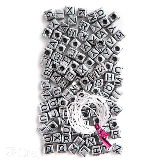 Koraliki, czarne literki na srebrnej bazie.