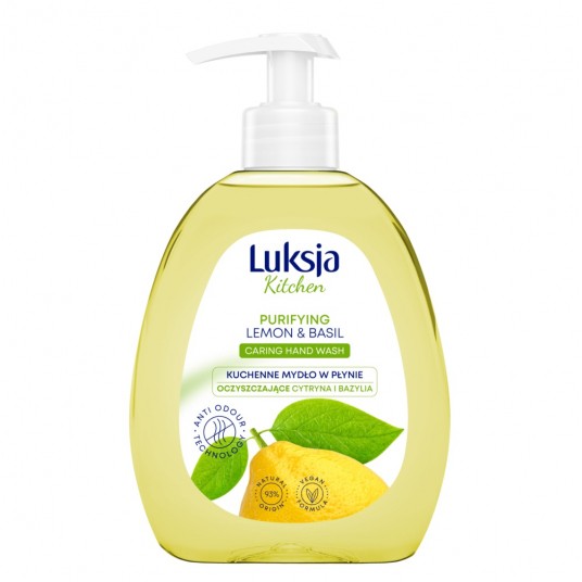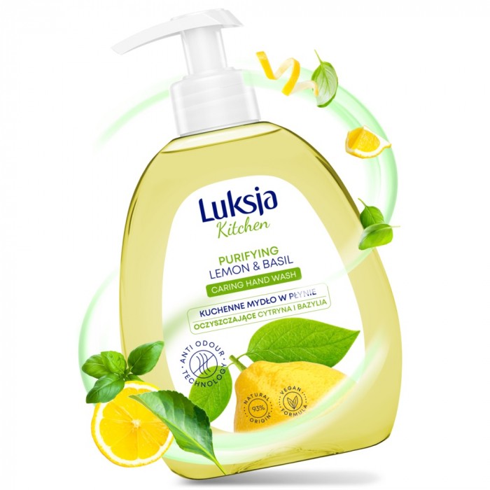 Kuchenne mydło w płynie Luksja Cytryna i Bazylia delikatnie oczyszcza i pielęgnuje dłonie podczas każdego mycia. Zostało wzbogacone o odświeżające olejki z cytryny i bazylii. Dzięki składnikowi neutralizującemu nieprzyjemne zapachy, eliminuje podczas mycia woń czosnku, cebuli, ryby. Trzymaj mydło przy kuchennym zlewie!