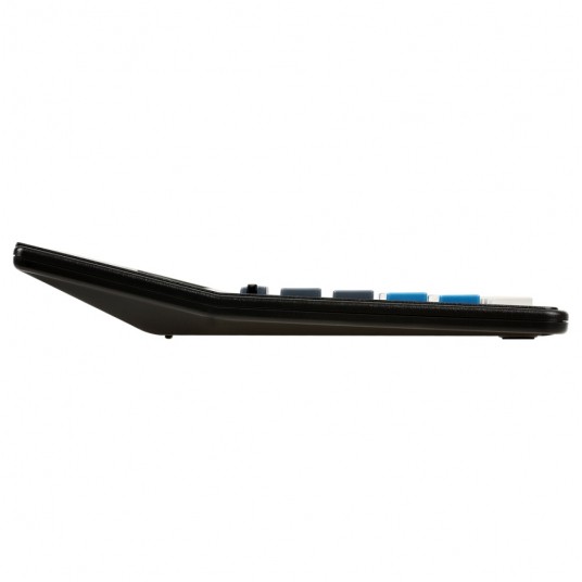 Kalkulator posiada 16-cyfrowy wyświetlacz, Pamięć 4-klawiszowa: MC, MR, M+, M-, Obliczanie marży [MU], Podwójna pamięć [MII], Pierwiastek kwadratowy [√], Podwójne zero [00]Potrójne zero [000], Procenty [%], Wybór dziesiętny, Zaokrąglanie wyników, Zmiana znaku [+/-], Wymiary: 205 x 155 x 35 mm, Waga: 189 g