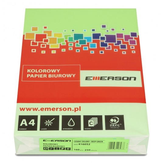 Papier kserograficzny Emerson Color Paper to bardzo niezwykły, innowacyjny a przede wszystkim najwyższej jakości produkt. Z pewnością spełni oczekiwania nawet najbardziej wymagających klientów. Ciemny, zielony kolor papieru sprawia, że jest on też wyjątkowo wyrafinowany. Występuje on w formacie A4, a jego gramatura to 160g/m². Papier pochodzi z zakładu znanego z dbałości o środowisko naturalne. Nienaganna opinia ze specjalistycznymi certyfikatami, jest wynikiem podporządkowania całego procesu technologicznego trosce o nasze otoczenie.