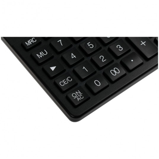 Kalkulator posiada 12-cyfrowy wyświetlacz, Pamięć 3-klawiszowa: MC, M+, M-, Podwójna pamięć [MII], Obliczanie marży [MU], Pierwiastek kwadratowy [√], Podwójne zero [00], Procenty [%], Wybór dziesiętny, Usuwanie ostatniej wprowadzonej pozycji, Zaokrąglanie wyników, Zmiana znaku [+/-].