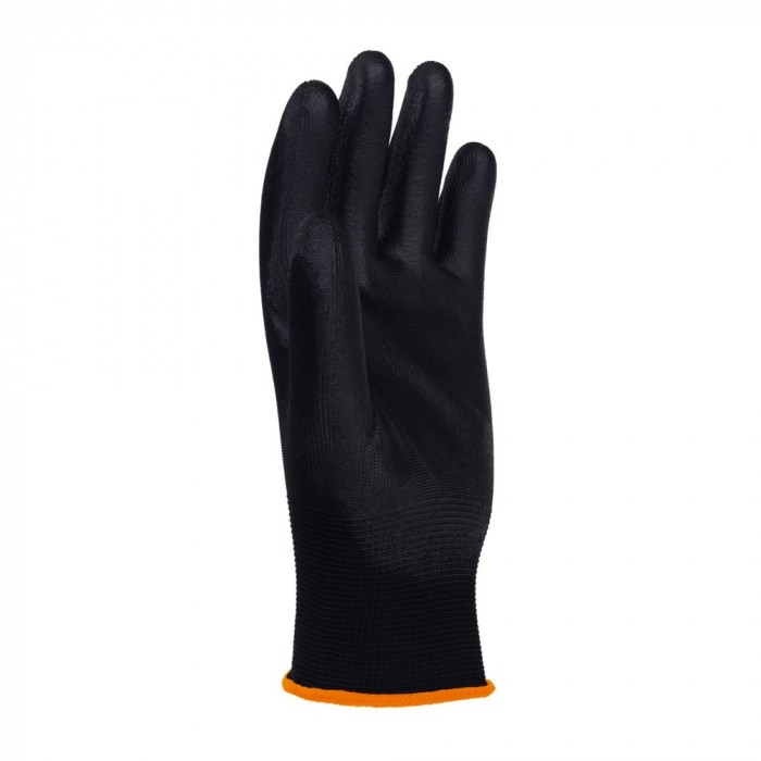 - rękawice wykonane z dobrej jakości dzianiny poliestrowej w kolorze czarnym, powleczone w części chwytnej czarnym poliuretanem