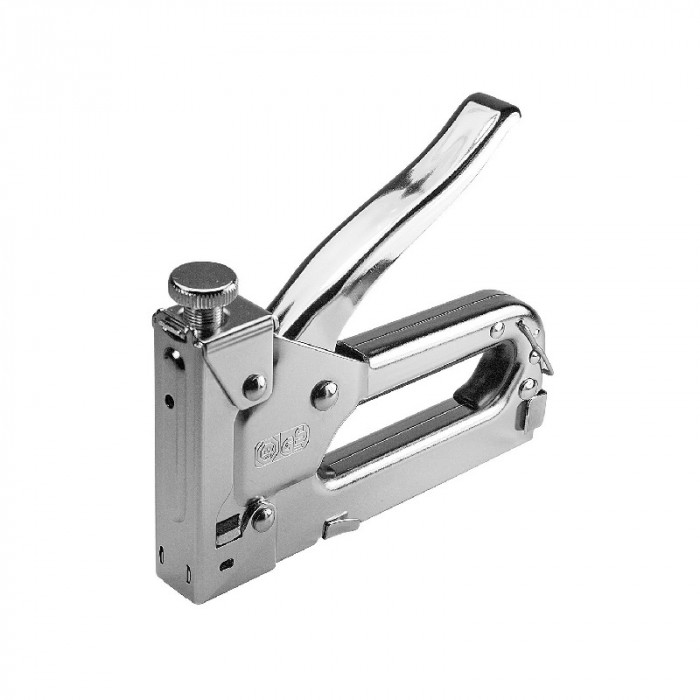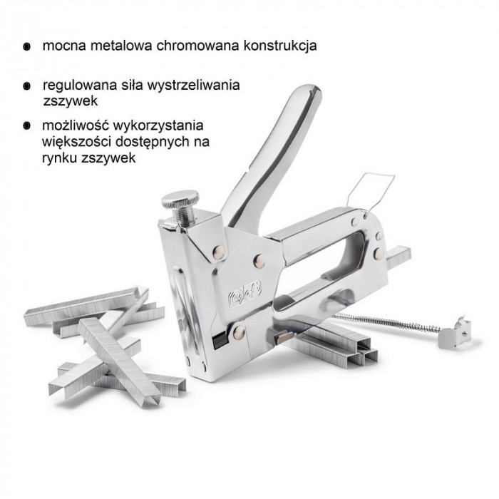 Metalowy solidny zszywacz tapicerski przeznaczony do prac dekoracyjnych, oraz lekkich prac monterskich. Mocna metalowa chromowana konstrukcja. Regulowana siła wstrzeliwania zszywek. Możliwość wykorzystania większości dostępnych na rynku zszywek. Rozmiar zszywek: 4 - 14 mm.