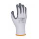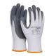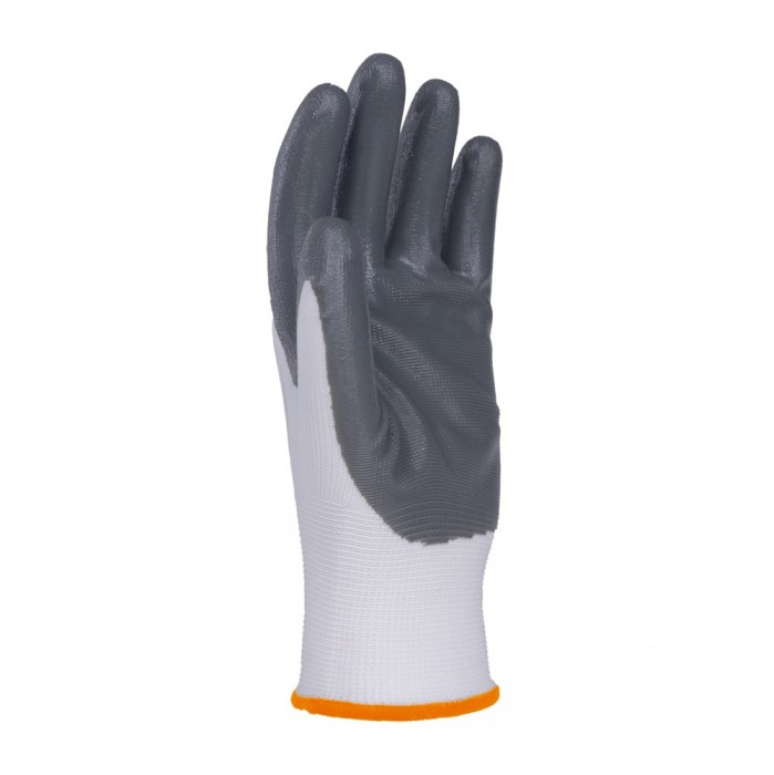 - rękawice wykonane z dobrej jakości dzianiny poliestrowej w kolorze białym, powleczone w części chwytnej szarym nitrylem