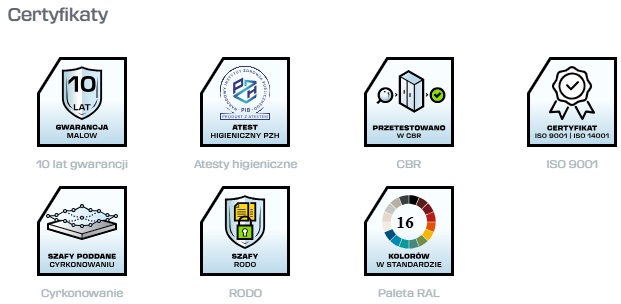 • Korpus szafki wykonany z blachy stalowej gr. 0,8 mm, fronty szuflad z blachy gr. 1,0 mm, pozostałe części szuflad z blachy gr. 0,6 mm.