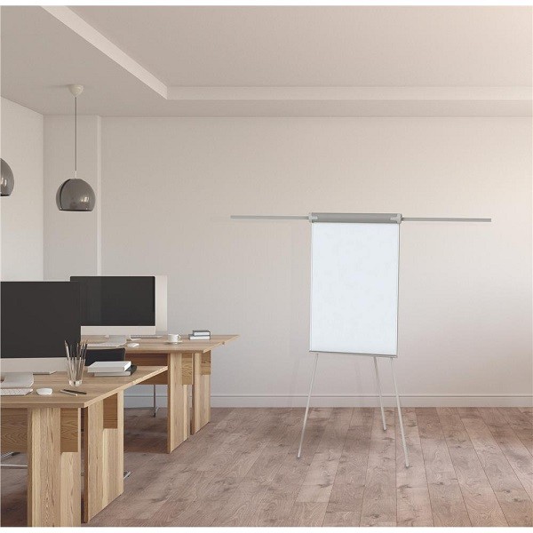 Flipchart z powierzchnią o właściwościach suchościeralnych i magnetycznych z 2 metalowymi ramionami. Powierzchnia wykonana ze stali lakierowanej w kolorze białym. Rozmiar tablicy 68x105 cm. Regulowana wysokość nóżek (do 180 cm). Stabilna aluminiowa konstrukcja w kolorze popielatym. Elegancki metalowy docisk do papieru oraz plastikowa rama i półka o długości 68 cm w kolorze popielatym. Okres gwarancji na powierzchnię wynosi 10 lat. Flipchart przeznaczony do pisania markerami oraz zawieszania kartek za pomocą magnesów. Produkt skierowany jest zarówno do biur, gdzie doskonale sprawdza się podczas spotkań, konferencji czy szkoleń i stanowi znakomite wsparcie dla liderów spotkań biznesowych, jak i rekomendowany jest do szkół, gdzie pełni rolę nowoczesnego środka dydaktycznego, dzięki któremu w jasny i czytelny sposób prezentowane są komunikaty wizualne podczas lekcji i wykładów. Flipcharty pozwalają w łatwy i szybki sposób zanotować i zaprezentować najistotniejsze informacje. Stanowią również doskonałą alternatywę dla tablic, których montaż jest często niemożliwy we wszystkich pomieszczeniach, w których odbywają się spotkania biznesowe. Flipcharty MemoBe posiadają Certyfikat Zgodności, który potwierdza, że wyrób spełnia wymagania zawarte w normie PN-EN 14434:2010, tzn. jest bezpieczny podczas jego montażu i użytkowania. Produkt opatrzony jest znakiem B (Bezpieczeństwo).