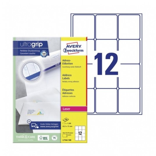 Białe etykiety adresowe L7164-100 do drukarek laserowych, w formacie 63,5x72 mm od AVERY ZWECKFORM są odpowiednie np. do adresowania kopert C4/C5. 1200 etykiet adresowych w opakowaniu na 100 arkuszach, posiadają certyfikat FSC®. Dzięki innowacyjnej technologii ultragrip masz pewność precyzyjnego prowadzenia arkusza w drukarce oraz gwarancję braku zacięć. Etykiety posiadają także unikalną krawędź QCT zapobiegającą wydostawaniu się kleju podczasdrukowania, co chroni drukarkę przed uszkodzeniami. Niezawodny druk w drukarkach laserowych został przetestowany i potwierdzony certyfikatem TÜV SÜD.