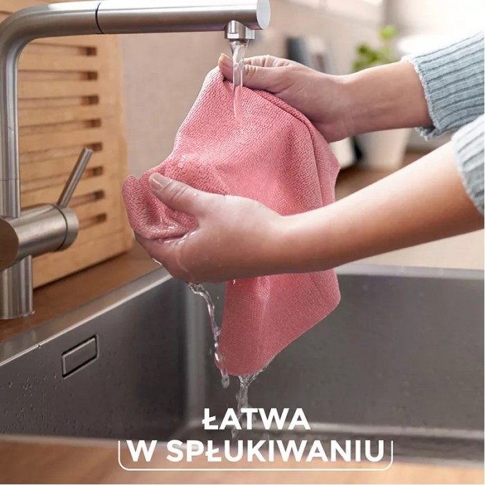 Ściereczka uniwersalna posiada powłokę poliuretanową, dzięki czemu jest łatwa w spłukiwaniu. Aby zachować jej świeżość po skończonym sprzątaniu opłucz ściereczkę pod bieżącą wodą i usuń z niej resztki brudu.