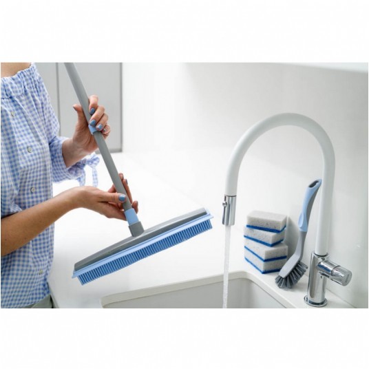 Innowacyjna gumowa miotła z teleskopowym trzonkiem, idealna do zamiatania włosiów, sierści, kurzu i innych zabrudzeń ze wszystkich powierzchni podłogowych.