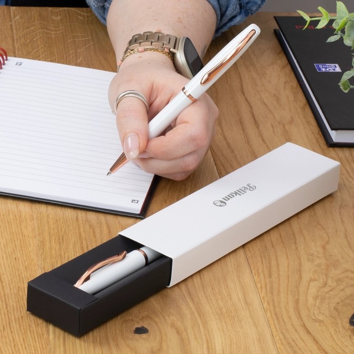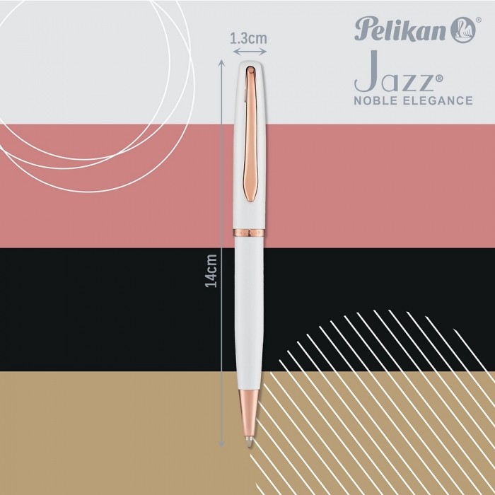 Pelikan Jazz Noble Elegance to długopis, który łączy ponadczasową estetykę z dbałością o detale i środowisko. Jego perłowa, subtelna powierzchnia w połączeniu z precyzyjnie wykonanymi metalowymi elementami tworzy elegancki, a zarazem nowoczesny wygląd. Sprężynowy klips w kształcie dziobu pelikana podkreśla prestiż i nawiązuje do tradycji marki. Wygodny mechanizm obrotowy pozwala na płynne wysuwanie wkładu, a doskonałe wyważenie sprawia, że pisanie tym długopisem to czysta przyjemność. Dodatkowo, długopis nadaje się do grawerowania i nadruku, a wszystkie metalowe części są w 100% przystosowane do recyklingu, co czyni go produktem nie tylko stylowym, ale też odpowiedzialnym.