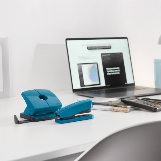 Poręczny zszywacz Novus B2 z serii ColorID 2 w atrakcyjnych pastelowych kolorach. Poręczny, do użytku w domu i małym biurze. Wykonany z metalu w obudowie z tworzywa sztucznego. Umożliwia zszycie permanentne, czasowe i tapicerskie dzięki obrotowej matrycy. System ładowania zszywek od góry. Magazynek na dwa rodzaje zszywek: 24/6 i 26/6. Maksymalna głębokość wsuwania kartki to 65 mm. Dołączone 200 zszywek 24/6 SUPER. Kolor niebieski (bright petrol).