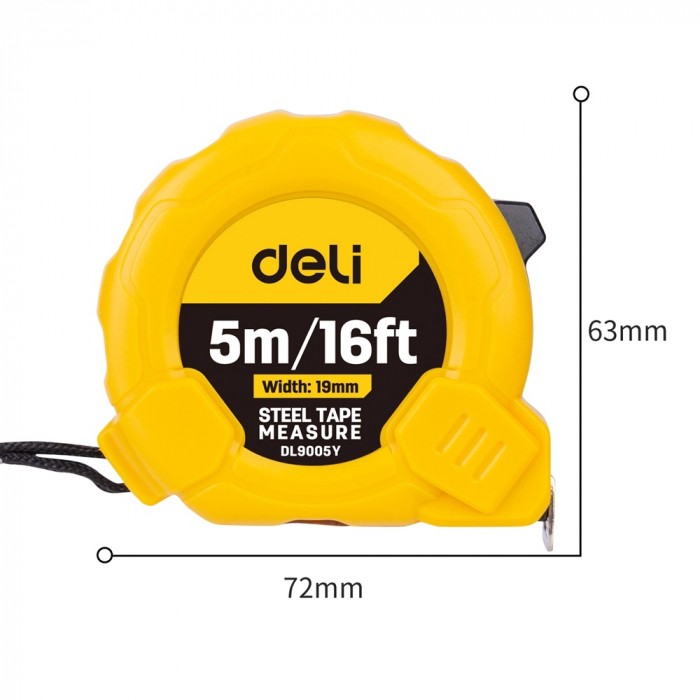Miara zwijana Deli Tools EDL9005Y ma wymiary obudowy ok. 72 × 63 mm i waży do 150 g. Wewnętrzne komponenty wykonano ze stali nierdzewnej w połączeniu z tworzywem ABS, co sprawia, że konstrukcja jest odporna na uderzenia i użytkowanie w trudnych warunkach. Zaczep do paska i pętla do przenoszenia wpływają na mobilność tego narzędzia podczas pracy w terenie.