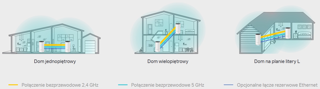 - Dzięki zaawansowanej technologii Mesh urządzenia będą się automatycznie przełączać podczas przemieszczania się po domu, aby korzystać z najszybszych dostępnych prędkości.