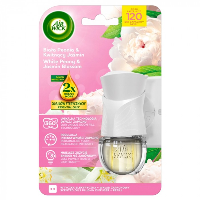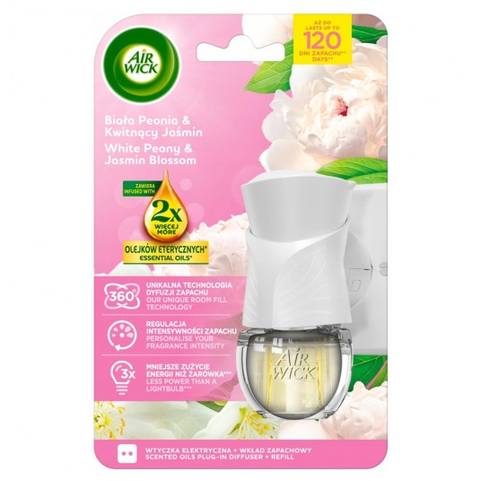 Zrelaksuj się w otoczeniu kwiatowego aromatu dzięki odświeżaczowi powietrza Air Wick z elektryczną wtyczką i wkładem zapachowym o nutach białej peonii i kwitnącego jaśminu. Produkt zawiera aż 2x więcej olejków eterycznych, oferując do 120 dni pięknego zapachu. Dzięki technologii dyfuzji 360°, regulacji intensywności zapachu i energooszczędnej pracy (3x mniejsze zużycie energii niż żarówka), jest to wygodne i stylowe rozwiązanie dla każdego wnętrza.